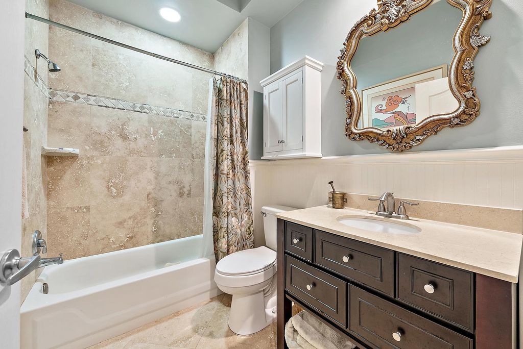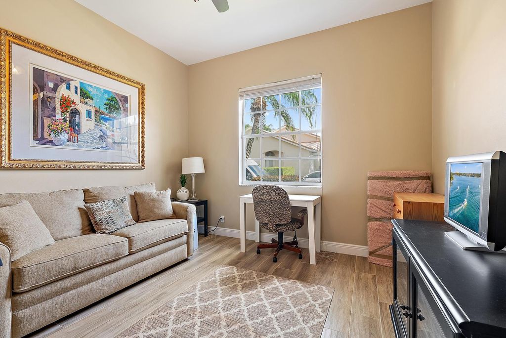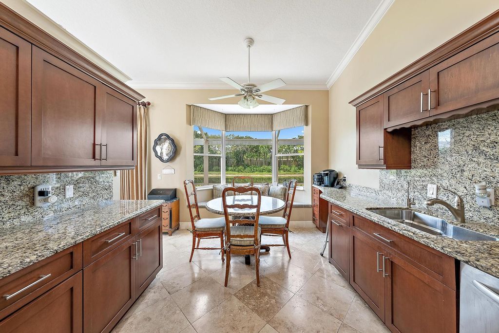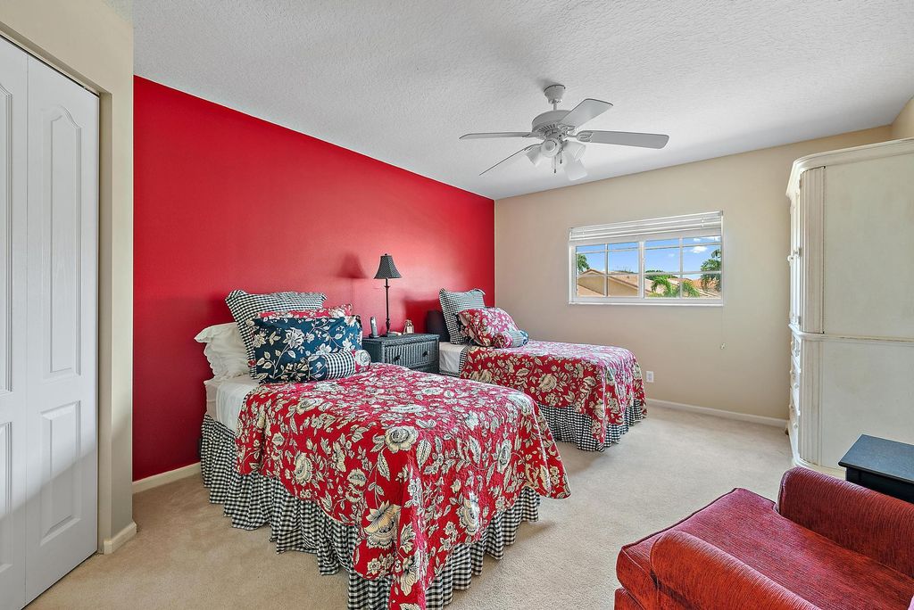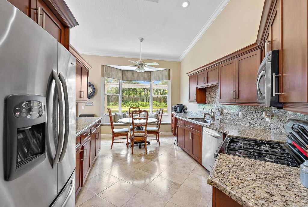 With a bright, Southern exposure overlooking serene lake views, and picturesque golf views to the west, this 2879 SF, 4BR/4BA+Den boasts soaring ceilings and redone porcelain floors. BRAND NEW ROOF AND GUTTERS, installed in 2023, With two primary suites, one upstairs and one downstairs, this home boasts an extraordinary number of rooms for this price range. With FOUR bedrooms (2 upstairs; 2 downstairs), plus a downstairs Office, this Ecclestone-built home offers wonderful upgrades. The expanded, renovated kitchen features custom cabinetry, granite tops and a suite of stainless appliances. Brand new (2025) hot water heater.