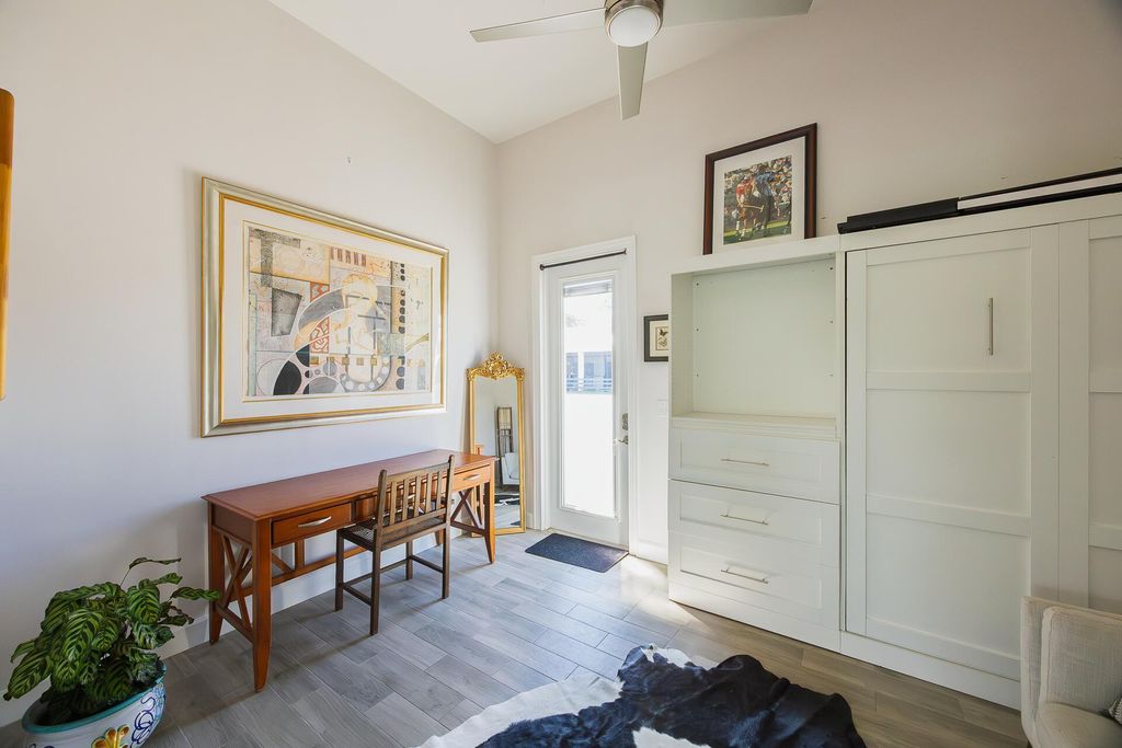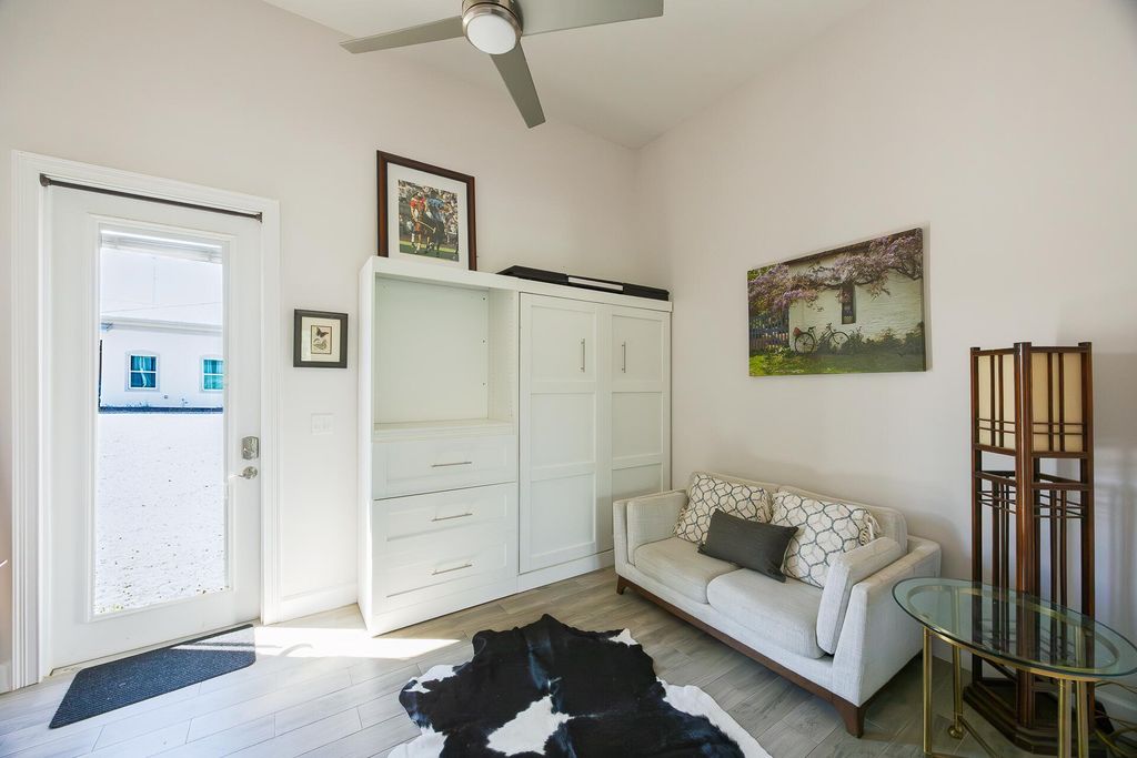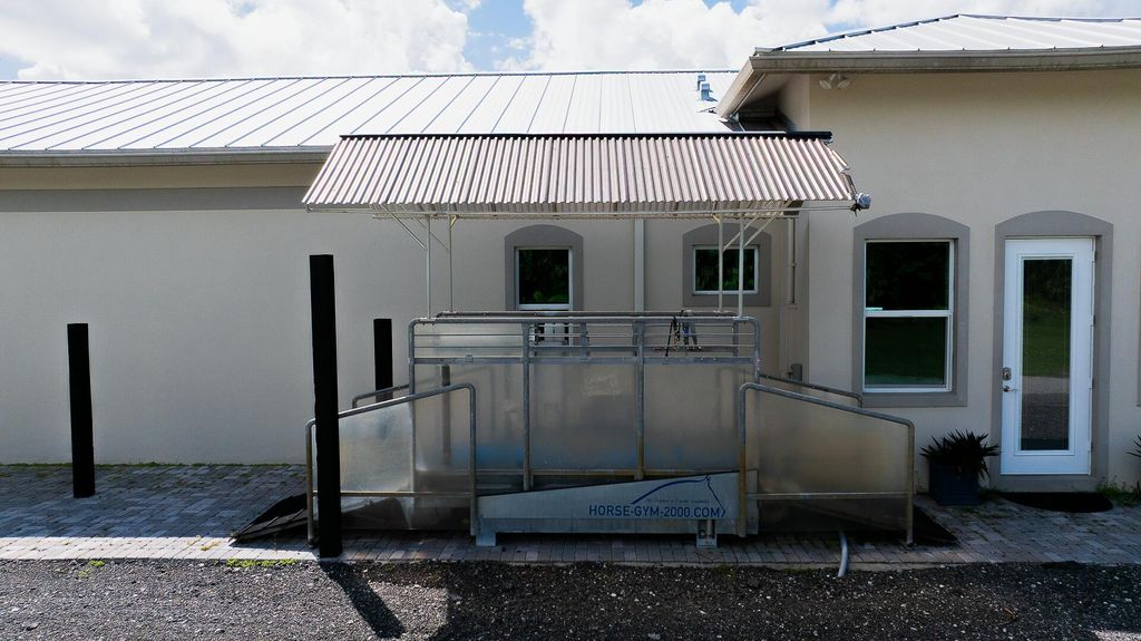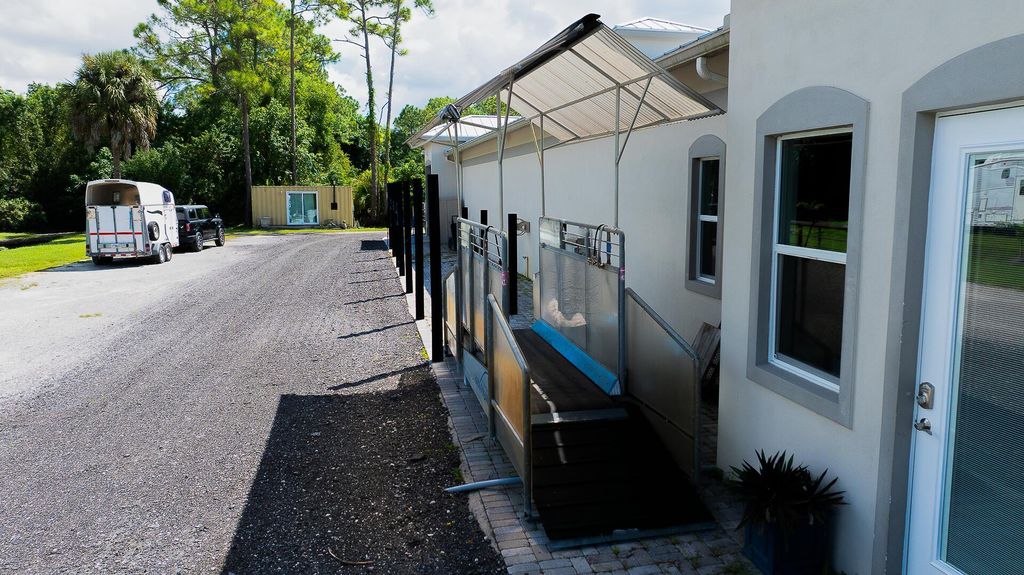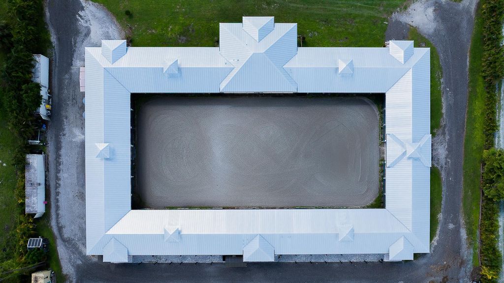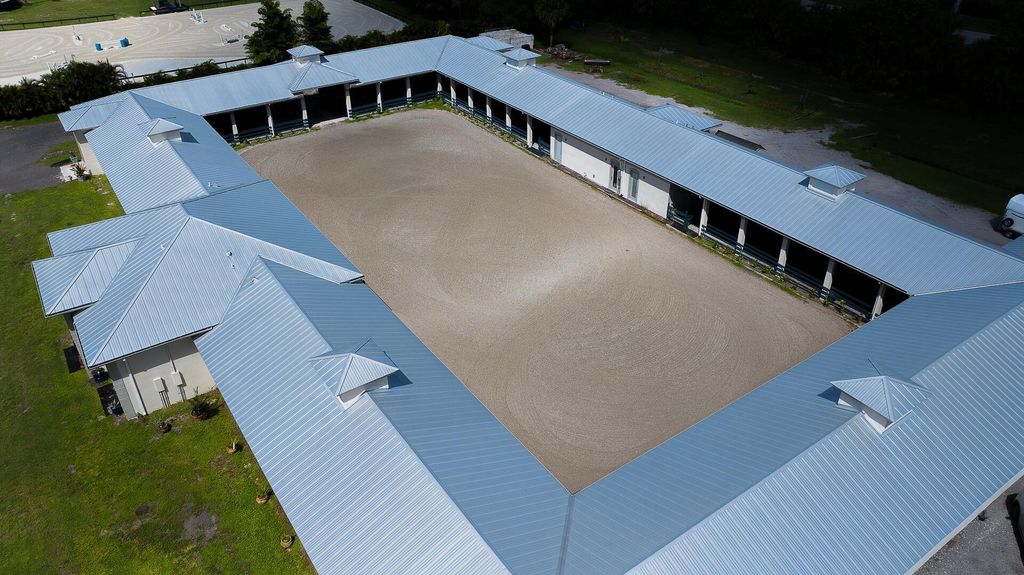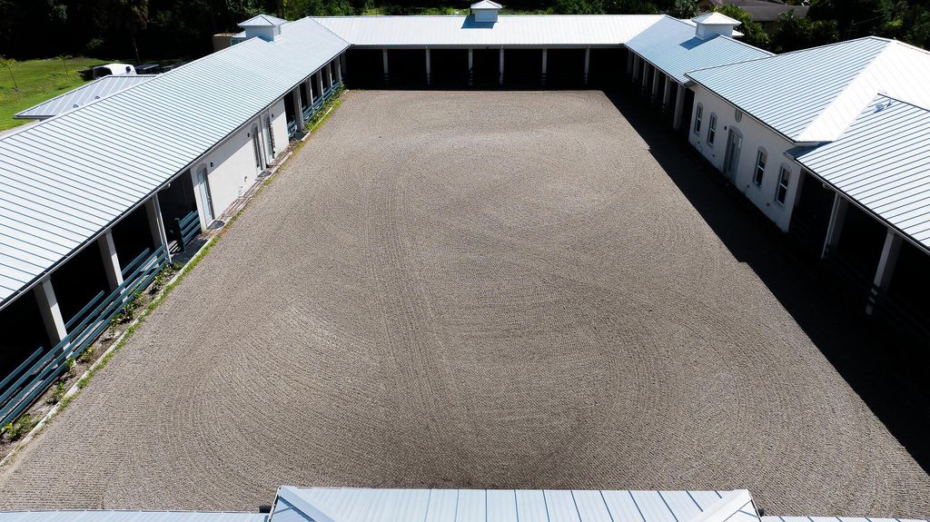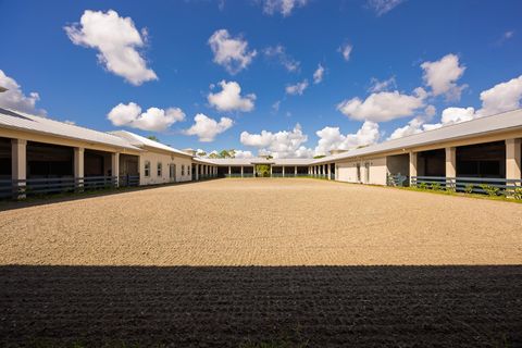 Exquisite Equestrian Estate Minutes from WEF. Nestled in a peaceful enclave and inspired by a custom designed Ralph Lauren farm, this newly constructed equestrian facility is designed for the discerning professional. With up to 40 stalls and two elegant living options-- gorgeous three-bedroom staff quarters and a pro residence --this property offers both sophistication and functionality.The courtyard-style barn features permanent stalls with filtered waterer in stalls and paddocks, 14′ ceilings, two air-conditioned tack rooms, 11 wash stalls, and rubber flooring. GGT courtyard arena and a large Equitan outdoor ring, Horsegym treadmill, and 10 beautiful grass paddocks--all set amid tranquil surroundings, ideal for preparation and recovery. Fans in stalls, fly spray system equipped.