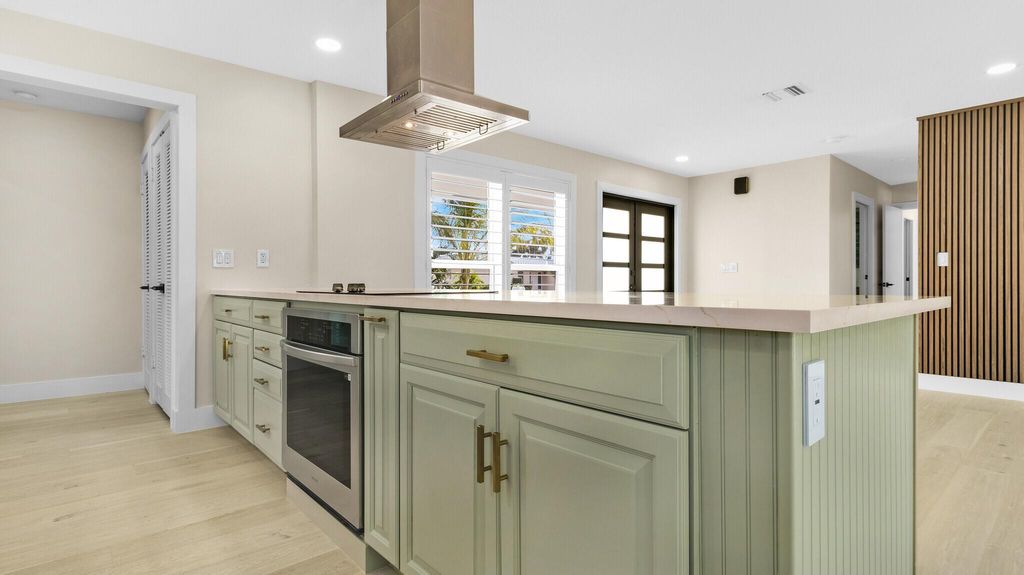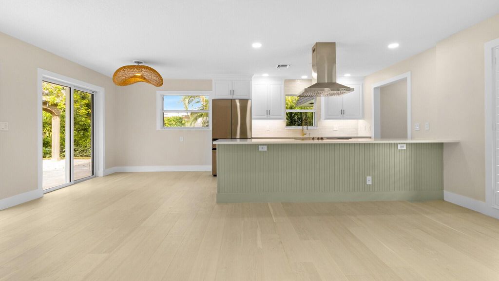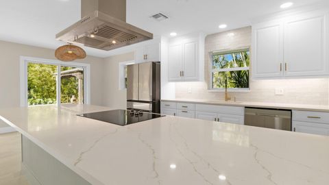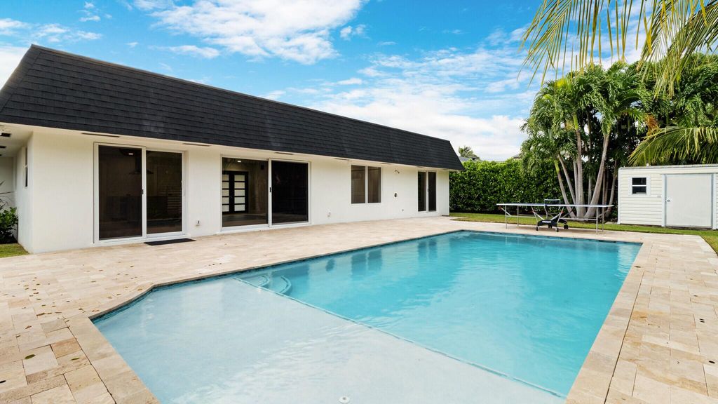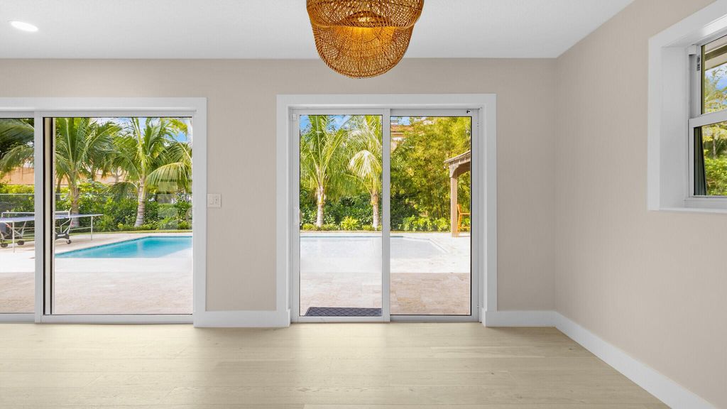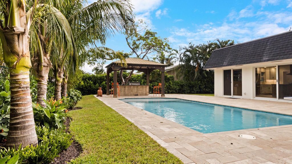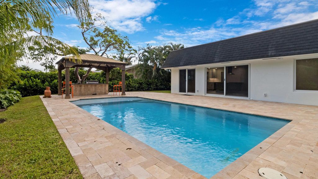 Newly renovated pool home in Hypoluxo Point. 4 Bedrooms 3 Full Baths. Fenced private back yard, tropical landscaping. Impact windows and doors. 2 bathrooms walk in showers. 3rd has a bathtub. Wood floors, recessed lighting. Bright open kitchen with cook island. Split bedrooms, built-in closets. Backyard has full outdoor kitchen with arbor. Water view of intracoastal. Great space for entertaining with large extended patio. Outdoor shower. Room for a golfcart on side yard. Full size Washer/Dryer. Double driveway. Close to beaches, waterfront dining. 18 minutes to PBI airport. Storage shed in back yard. Pool has a child safety fence available. Rent includes yard & pool maintenance. No Homeowner Association. Available for occupancy November 21, 2025. UNFURNISHED. Some photos have staging.